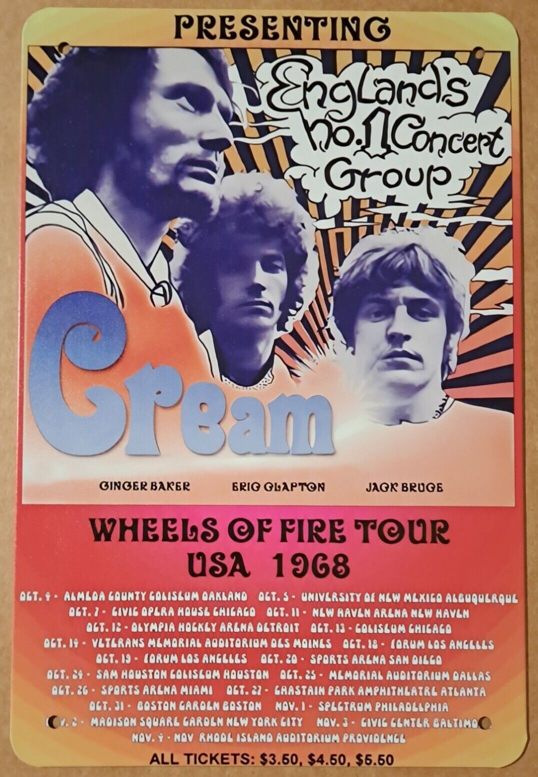 Cream announced the end of the band in May 1968, due to tensions between Bruce and Baker. Wheels of Fire was released in August of that year and the band undertook a final United States and European tour during October-November to promote the album, with two final concerts at London's Albert Hall on 25 and 26 November.